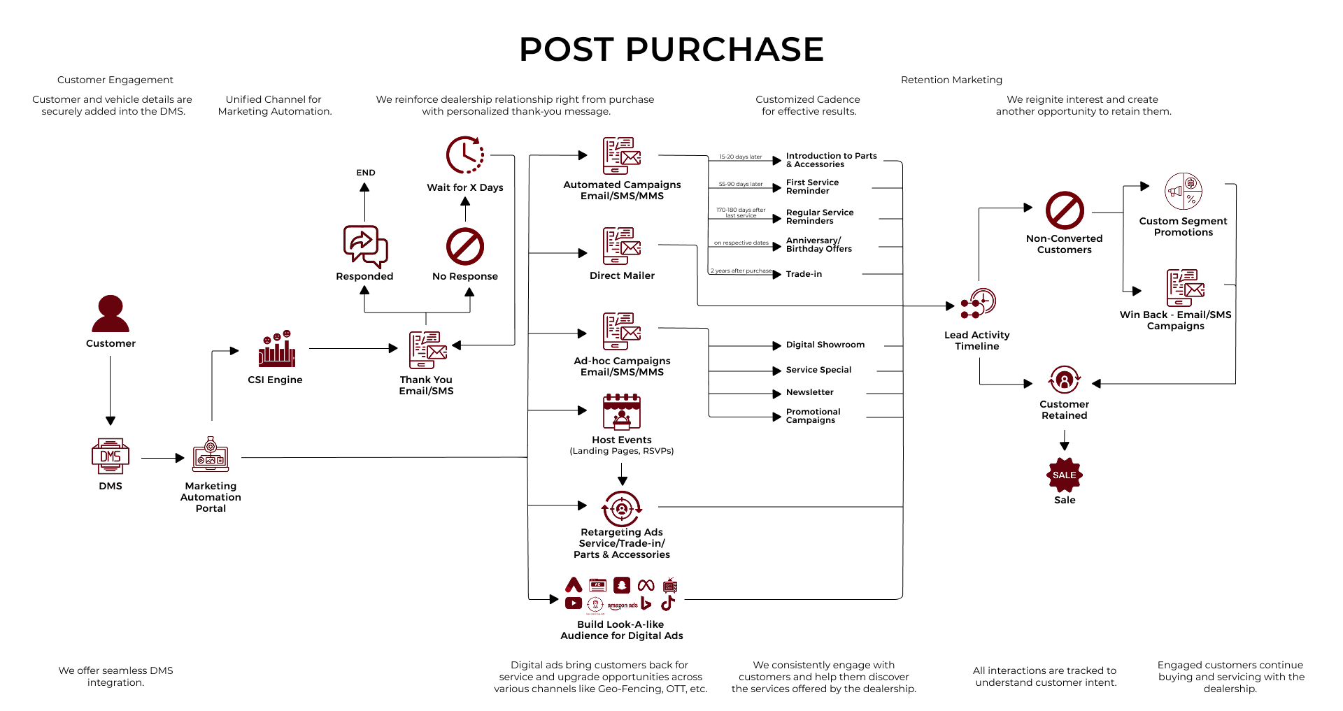 After the sale, the CMap Customer Loyalty Solution takes center stage. Its focus is on building and retaining customer loyalty, ensuring each interaction amplifies engagement. The solution automates ongoing communications, including personalized emails, satisfaction surveys, reward programs, and service reminders. With performance tracking and integration with your existing CRM or CX platforms, brands can monitor loyalty metrics, respond proactively to customer needs, and turn buyers into advocates.